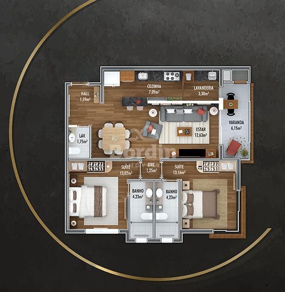 Apartamento de 86.62m² de área privativa. Conta com cozinha, sala de jantar e sala de estar com espera para lareira, com acesso direto à varanda, proporcionando um ambiente iluminado e arejado. Inclui ainda área de serviço, lavabo e duas suítes, além de uma vaga de garagem. Apresenta acabamentos em gesso, pisos vinílico e de porcelanato e esquadrias em PVC com vidros duplos, garantindo conforto e eficiência. Dispõe também de fechadura digital, garantindo mais segurança e praticidade.