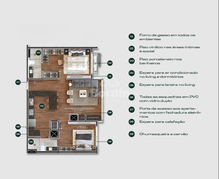 Apartamento de 69,67m² de área privativa, localizado no bairro Floresta. Possui cozinha com churrasqueira, sala de jantar, sala de estar com espera para lareira, área de serviço, banheiro social e duas suítes, sendo uma delas no modelo americano. Inclui uma vaga de garagem e fechadura digital na porta de entrada, para maior segurança e comodidade, além da ótima posição solar.