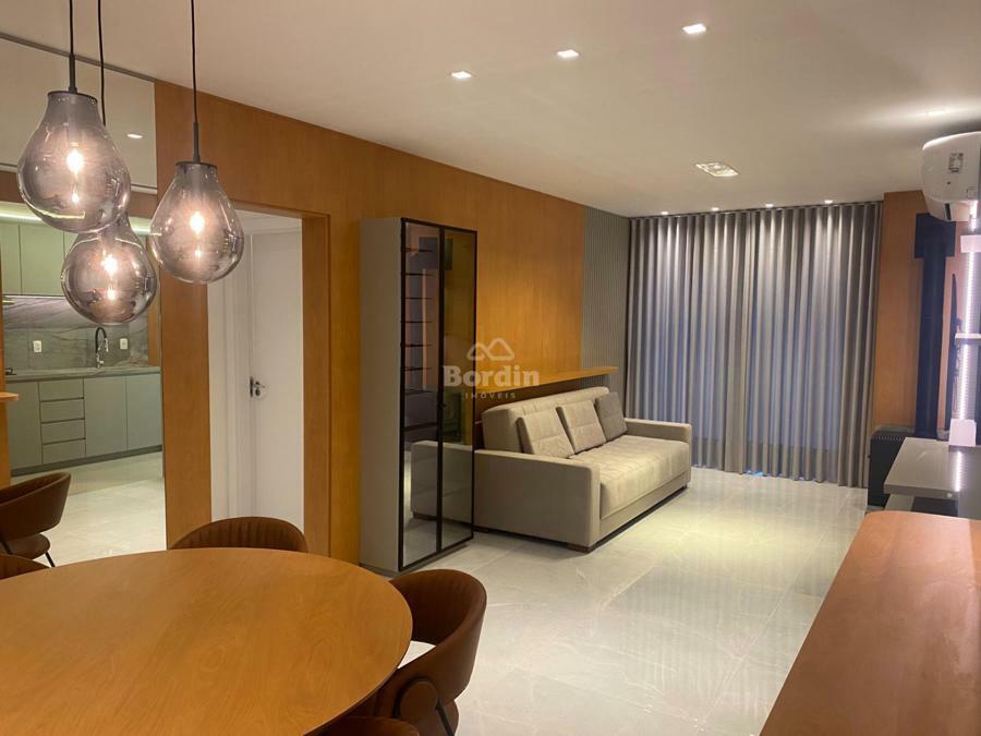 Apartamento mobiliado e decorado com área privativa de 82,95m². Possui cozinha equipada com churrasqueira, sala de jantar, sala de estar com lareira e ar-condicionado, área de serviço, lavabo e duas suítes. Inclui uma vaga de garagem.