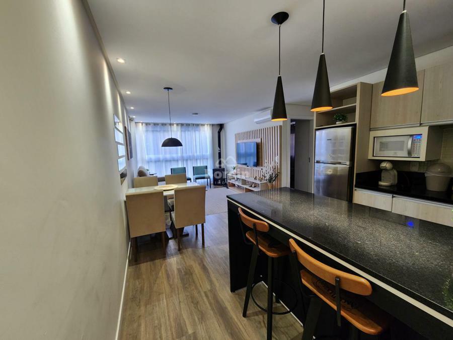Apartamento mobiliado e decorado com 71,07 m² de área privativa. Conta com cozinha com churrasqueira, sala de jantar, sala de estar com lareira, ar condicionado e vista deslumbrante. Possui área de serviço separada, banheiro, um dormitório e uma suíte, ambos com ar condicionado, além de uma vaga de garagem. O imóvel ainda dispõe de espera para calefação, acabamentos em gesso rebaixado, esquadrilhas de PVC, detalhes em granito e piso de porcelanato, proporcionando um alto padrão de conforto e sofisticação.