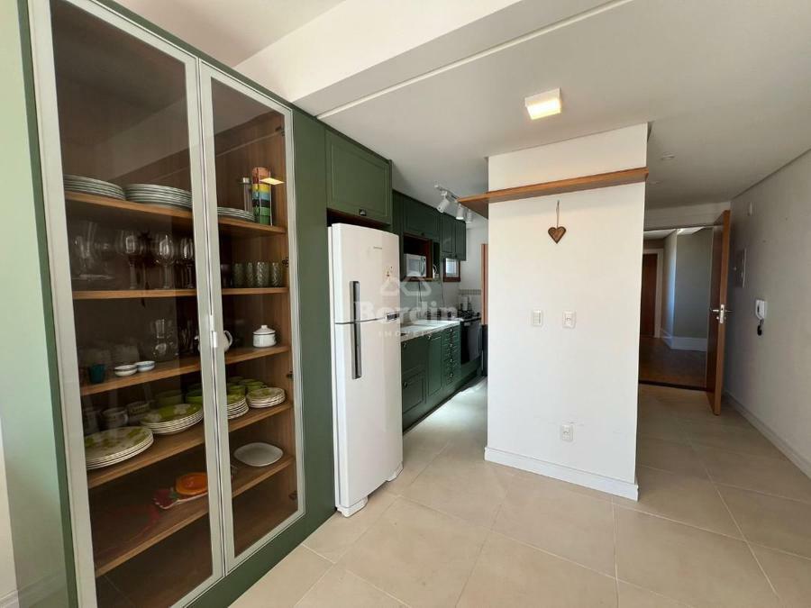 Cobertura mobiliada com 83,27m² de área privativa. Composta por cozinha equipada com churrasqueira, sala de jantar, sala de estar com lareira integrada à sacada fechada, área de serviço, banheiro social e dois dormitórios, sendo uma suíte. Inclui uma vaga de garagem.