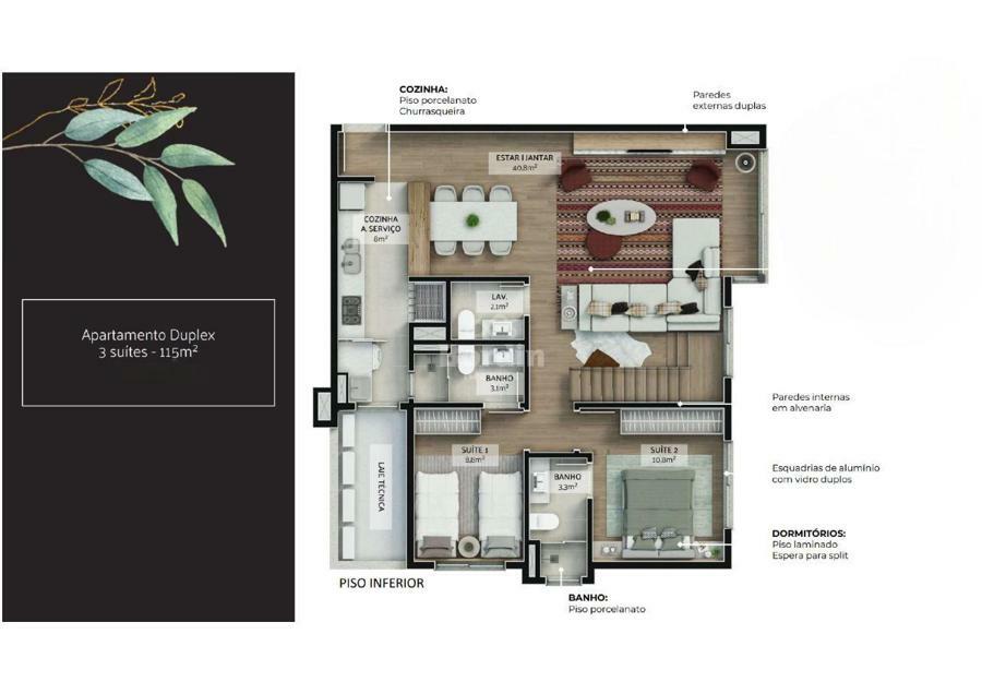 Inclui acabamentos em gesso, pisos em porcelanato e vinílico, e esquadrilhas de alumínio com vidros duplos, que proporcionam maior isolamento térmico e acústico. Também possui esperas para ar-condicionado e lareira, fechadura eletrônica para maior segurança e medidores de consumo individuais, promovendo mais eficiência e controle.