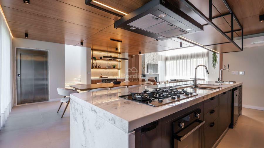 Possui cozinha americana com churrasqueira, integrada à sala de jantar e à sala de estar com lareira, criando um ambiente amplo e acolhedor. Dispõe de cinco suítes, todas com persianas automatizadas, sendo uma térrea e duas com calefação. A suíte master conta com closet e banheira de hidromassagem.