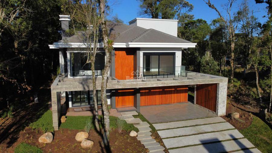 Casa de dois pavimentos com área construída de 355,87m², localizada em loteamento. No térreo, possui cozinha americana com ilha e churrasqueira, integrando-se à varanda com lareira, sala de jantar, sala de estar com lareira e pé direito duplo, lavabo, área de serviço separada, despensa e elevador para acessibilidade e conforto.